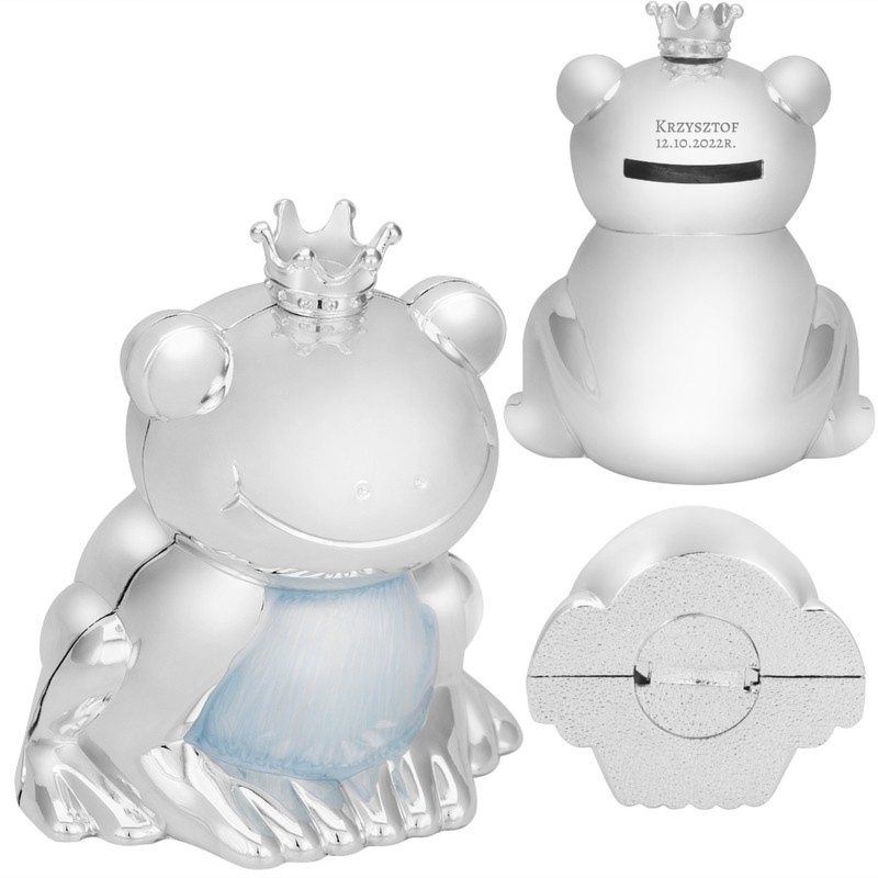 Błękitna skarbonka żabka ze stali posrebrzanej z grawerem na głowie, z możliwością otwarcia, w pudełku od producenta