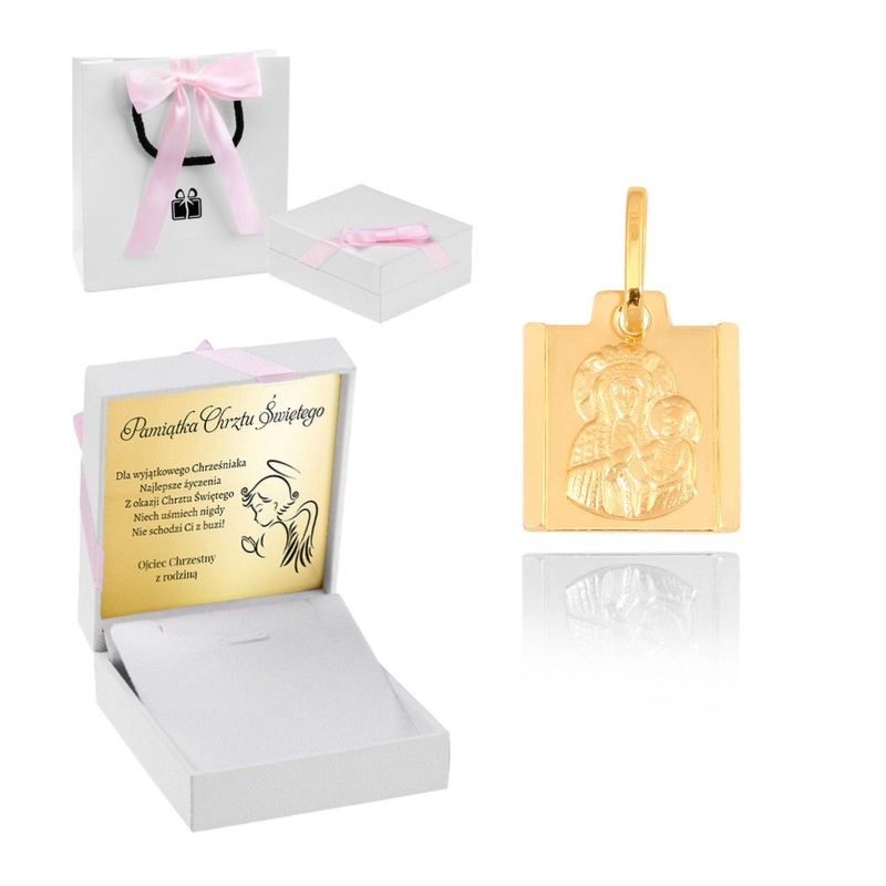 Złoty medalik Matka Boska ze złota pr. 585 z tabliczką z nadrukiem, w pudełeczku z różową wstążką i torebką prezentową