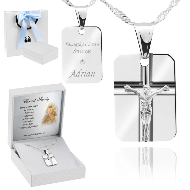 Prostokątny srebrny medalik 925 z Jezusem na krzyżu, z łańcuszkiem, grawerem na rewersie oraz tabliczką z dowolną dedykacją