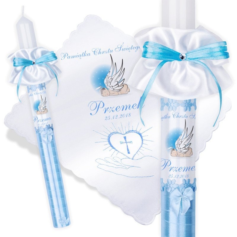 Ręcznie zdobiona świeca i satynowa szatka z niebieską dłonią oraz nadrukiem zdjęcia lub grafiki i napisów na obu elementach