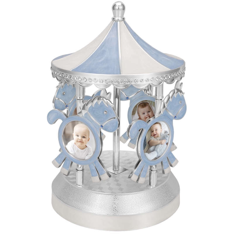 Różowa karuzela retro z ruchomymi konikami i dwustronnymi ramkami na zdjęcia, metal z masą perłową, melodia Rock a bye baby