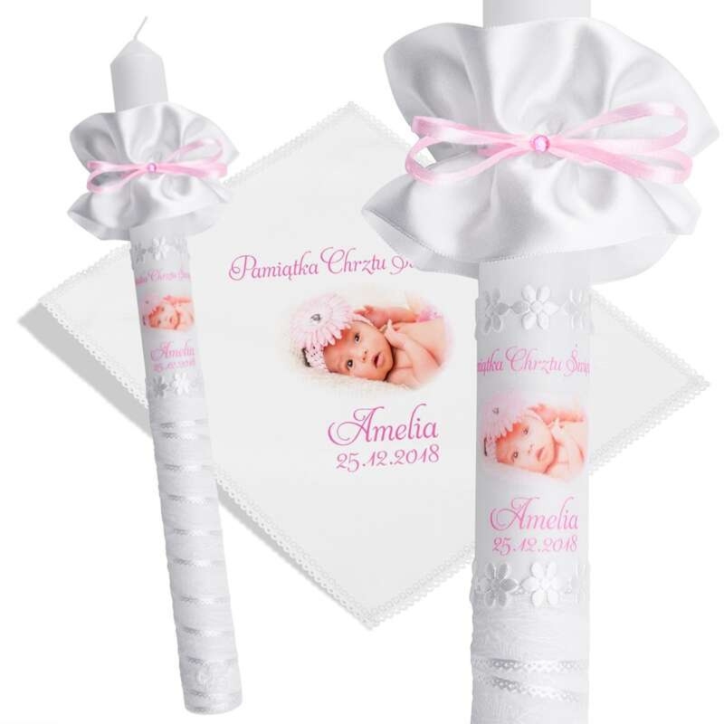 Biały zestaw świecy i szatki na Chrzest/Komunię z nadrukiem zdjęcia lub grafiki oraz wyborem koloru napisów, z profitką i okapnikiem
