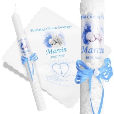 Chrzest/Komunia: koronkowa świeca i szatka niebieska z nadrukiem