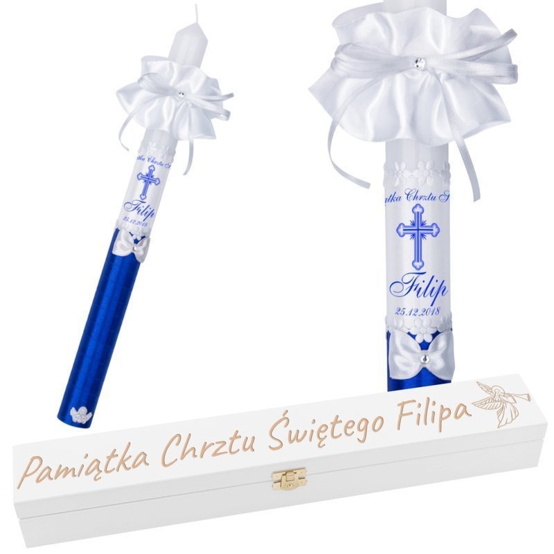 Zestaw G10 do Chrztu lub Komunii: świeca z nadrukiem zdjęcia lub grafiki i napisów oraz skrzynka na świece z grawerem