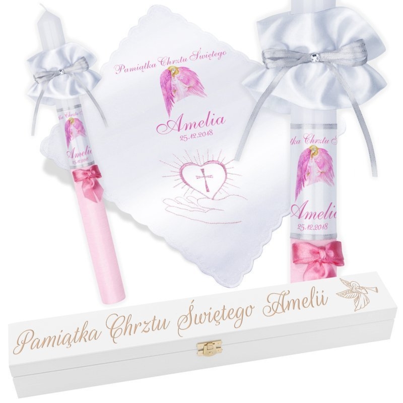 Model G17: ręcznie zdobiona świeca i satynowa szatka różowa z nadrukiem zdjęcia lub grafiki, skrzynka z grawerem laserowym