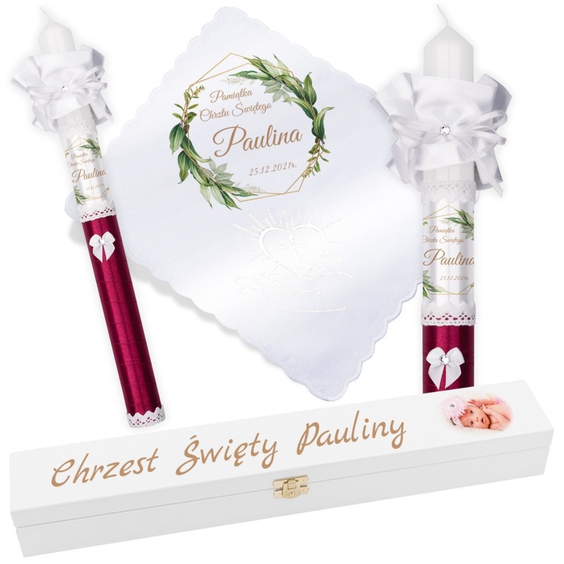 Świeca i szatka do Chrztu lub Komunii ze zdjęciem dziecka, personalizacja sublimacją oraz pudełko z nadrukiem UV na wieku