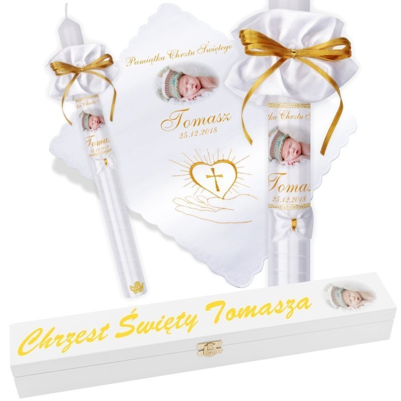 Model G3: świeca i szatka ze zdjęciem dziecka lub grafiką, złote akcenty i skrzynka z nadrukiem UV do przechowywania