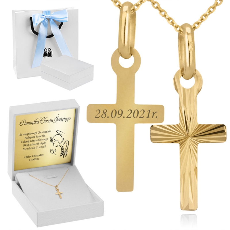 Zestaw dla chłopca: złoty krzyżyk i łańcuszek pr. 585, grawer max 10 znaków, białe pudełko, dedykacja na tabliczce i torebka ze wstążką