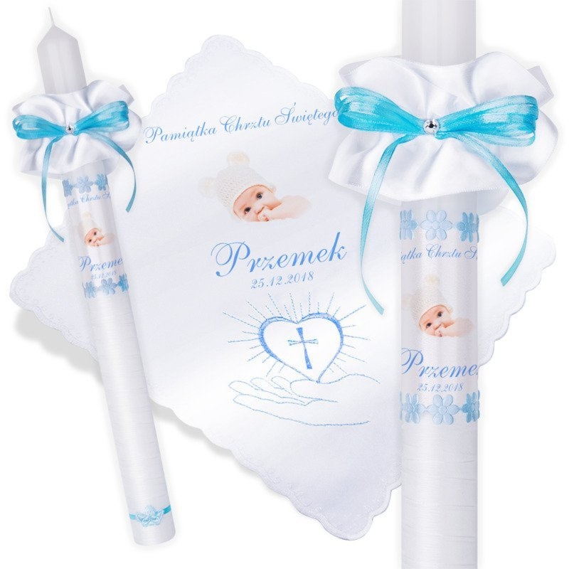 Model G15: ręcznie zdobiona świeca i satynowa szatka z niebieskim haftem dłoni, z nadrukiem zdjęcia lub grafiki oraz napisów na obu elementach