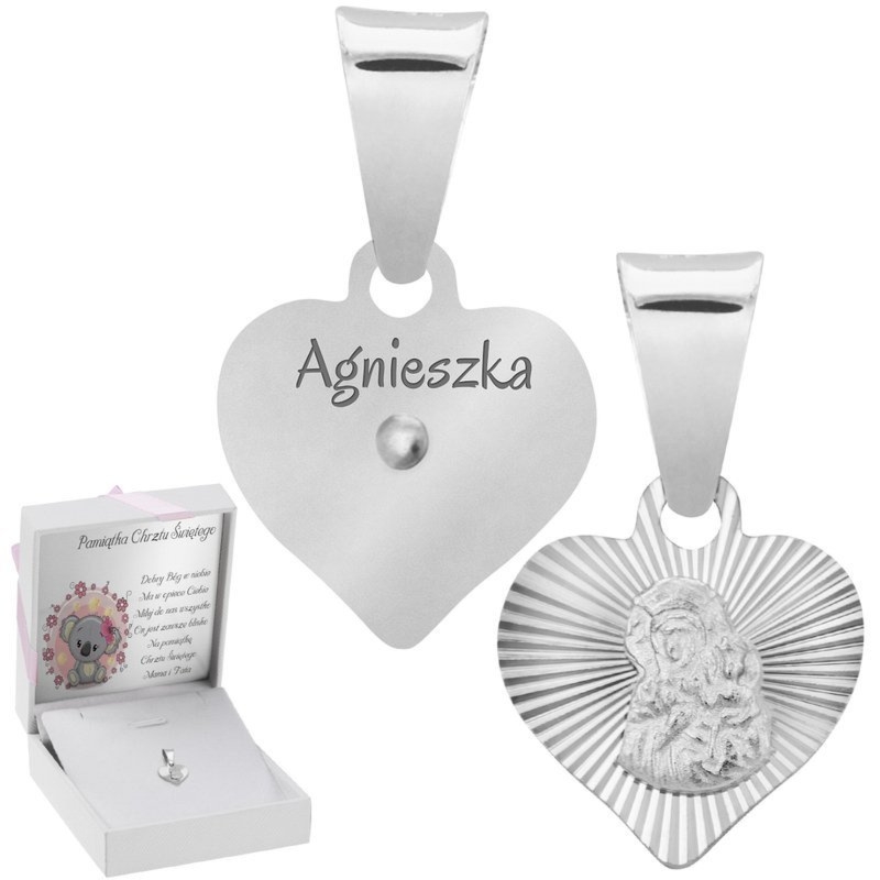 Srebrny medalik serce 925 z Matką Boską Częstochowską, grawer laserowy na odwrocie i tabliczka z dedykacją w pudełku z różową kokardką