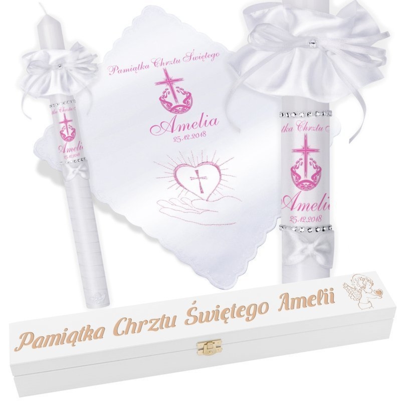 Model G14: ręcznie zdobiona świeca i satynowa szatka w tonacji różowej z nadrukiem zdjęcia lub grafiki oraz skrzynka na świece z grawerem