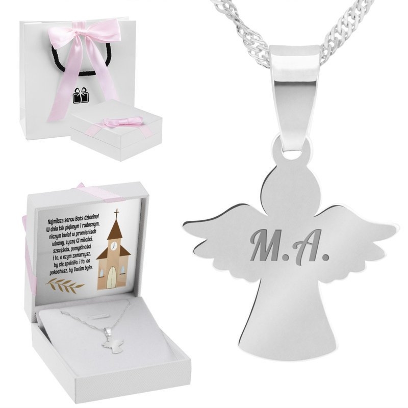 Srebrna zawieszka z motywem anioła (próba 925) z łańcuszkiem Singapur oraz niewielkim grawerunkiem i tabliczką z dedykacją