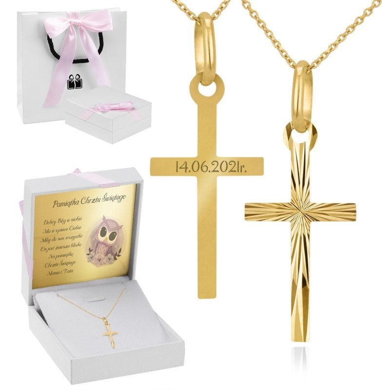 Zestaw: złoty krzyżyk i łańcuszek próby 585 z grawerem imienia lub daty, w pudełku z różową kokardką i torebce prezentowej