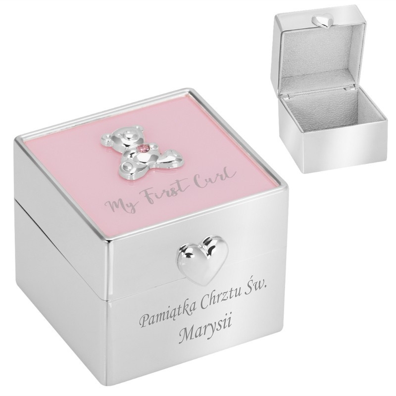 Różowo-srebrne puzderko na pierwszy pukiel włosów z misiem, napisem My First Curl. i różowym kryształkiem oraz dowolnym grawerem laserowym