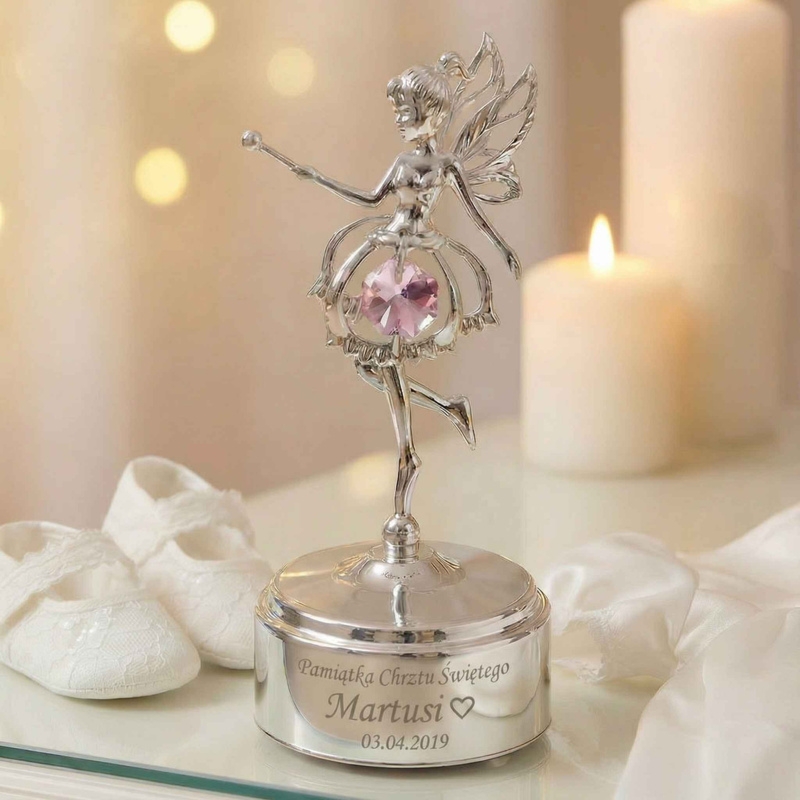 Posrebrzana mała pozytywka dziewczynka elf z różowym kryształem, melodia It’s a Small World i grawer laserowy z przodu podstawy