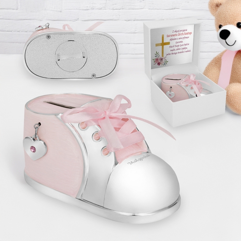 Chrzest lub roczek: Posrebrzana skarbonka różowy bucik z grawerem