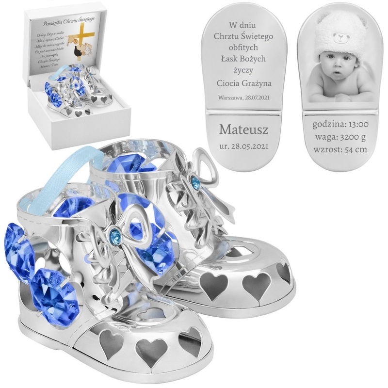 Posrebrzane buciki z niebieskimi kryształami i błękitną wstążką, z grawerem diamentowym na podeszwach oraz dedykacją w zestawie