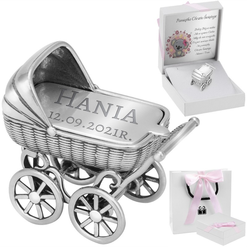 Srebrny wózek puzderko 925 dla dziewczynki z grawerem na osłonie i metalową tabliczką z dedykacją, w pudełku z różową kokardką