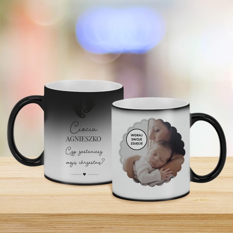 Magiczny kubek ceramiczny zmieniający kolor pod wpływem ciepła, z pytaniem dla przyszłej Matki Chrzestnej i personalizacją imienia oraz zdjęcia