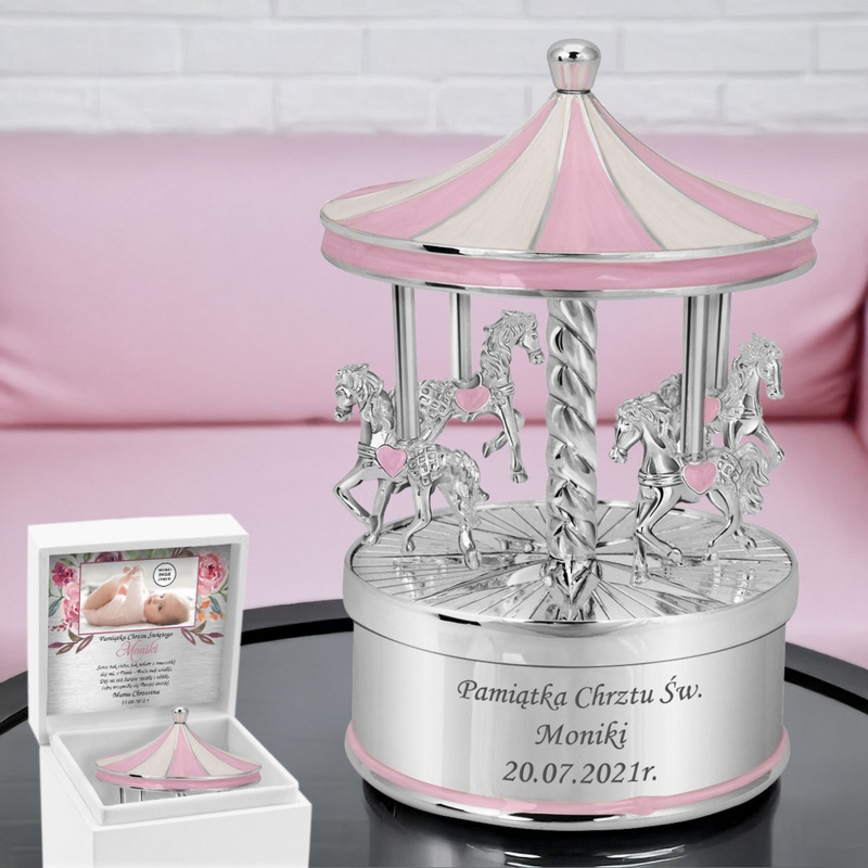 Karuzela z konikami ze stali posrebrzanej, cyrkonie i melodia Rock a bye Baby, grawer na podstawie oraz na pudełku w zestawie
