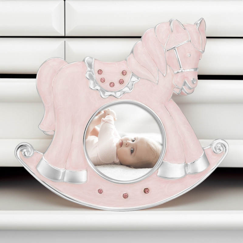 Różowa ramka na zdjęcie na chrzest ze stali i masy perłowej, ozdobiona różowymi kryształkami, z lakierem ochronnym i tyłem z czarnego weluru