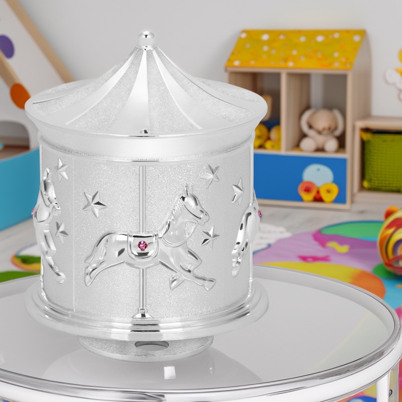 Błękitna pozytywka karuzela z austriackimi kryształkami, wykonana z platerowanej stali, melodia Rock a bye baby, w zestawie pudełko