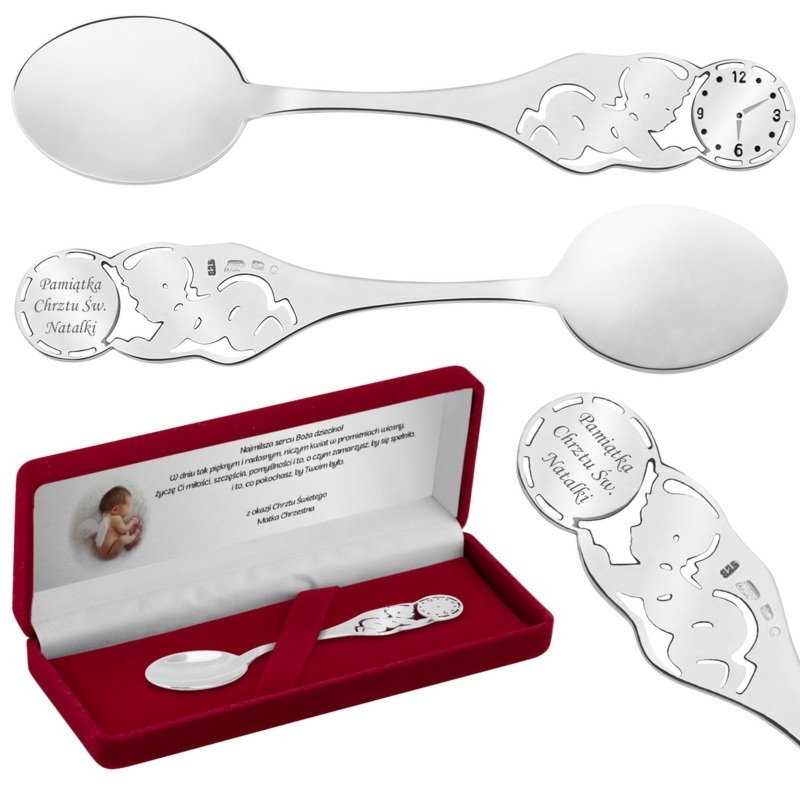 Srebrna łyżeczka 925 z zegarem, grawer na obu stronach i metalowa tabliczka z dedykacją w welurowym pudełku, kolor do wyboru