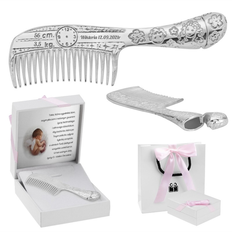 Srebrny grzebyk 925 na Chrzest dla dziewczynki z grawerem imienia, wagi i wzrostu oraz metalową tabliczką z dedykacją