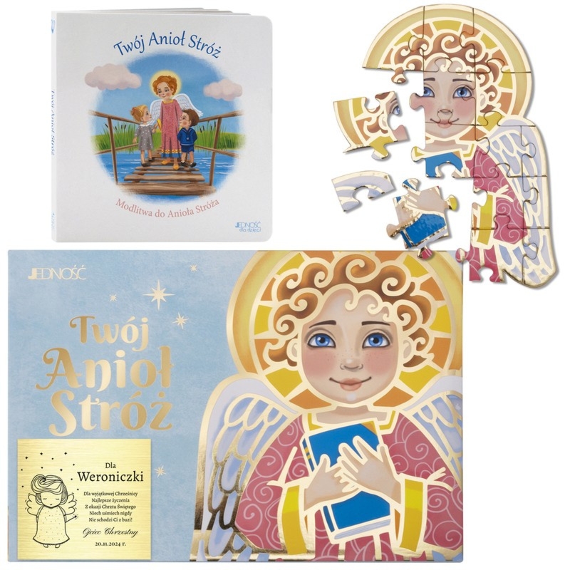 Zestaw "Twój Anioł Stróż" w ozdobnym pudełku: książeczka z modlitwą, złocone puzzle 30 elementów i metalowa tabliczka z personalizacją