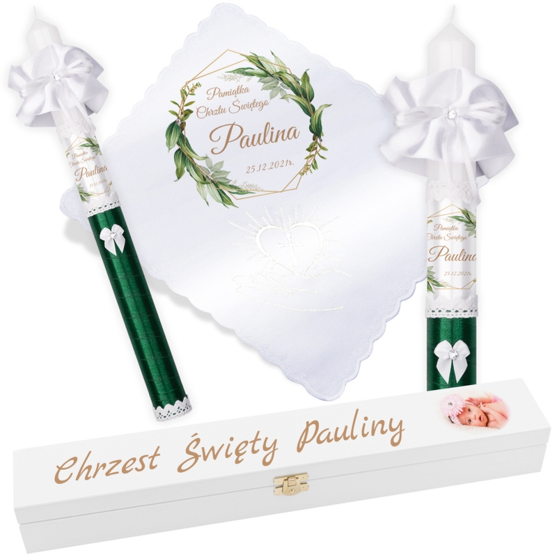 Chrzest: świeca i szatka G23 ze zdjęciem, pudełko z nadrukiem UV