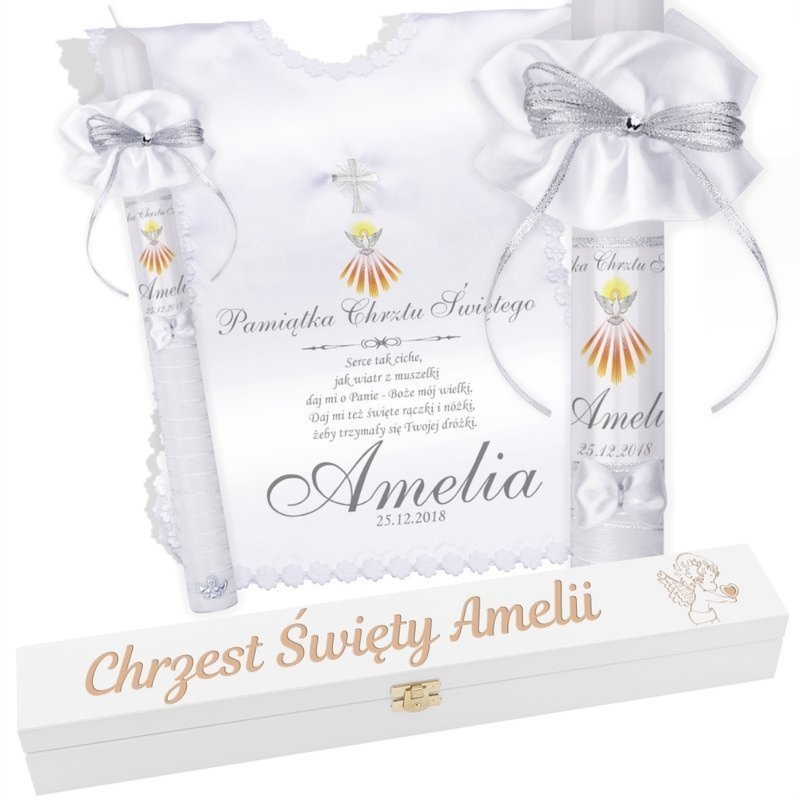 Szatka papieska z srebrnym haftem krzyża, ręcznie zdobiona świeca i pudełko z grawerem laserowym oraz personalizacją imieniem lub zdjęciem