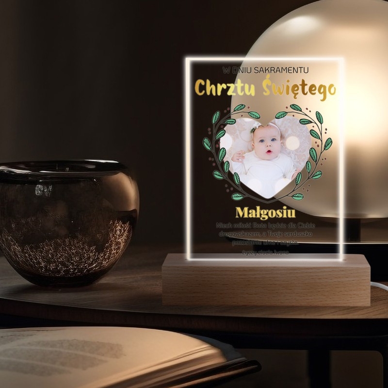 Personalizowana ramka LED na Chrzest z akrylu i drewna, z nadrukiem imienia, daty oraz cytatu lub symbolu religijnego