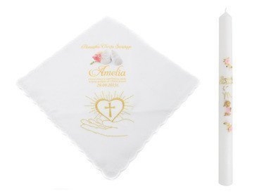Chrzest: szatka ze złotym sercem i świeca, nadruk na szatce