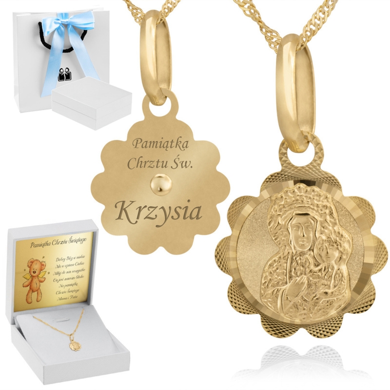 Chrzest: Złoty medalik Matka Boska Częstochowska 585 z grawerem