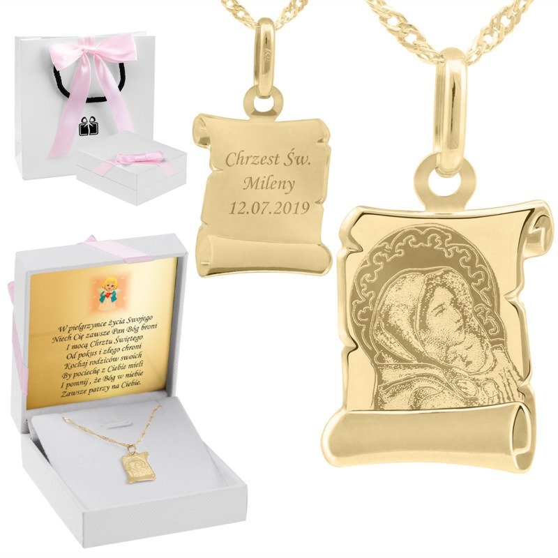Komplet ze złota pr. 585: medalik papirus Matka Boska z Dzieciątkiem, łańcuszek singapurski i grawer na rewersie (ok 20 znaków)