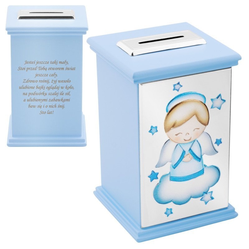 Drewniana skarbonka z aniołkiem i frontem MIRO-SILVER, z tyłu dowolny grawer laserowy bez limitu znaków oraz możliwość grafiki