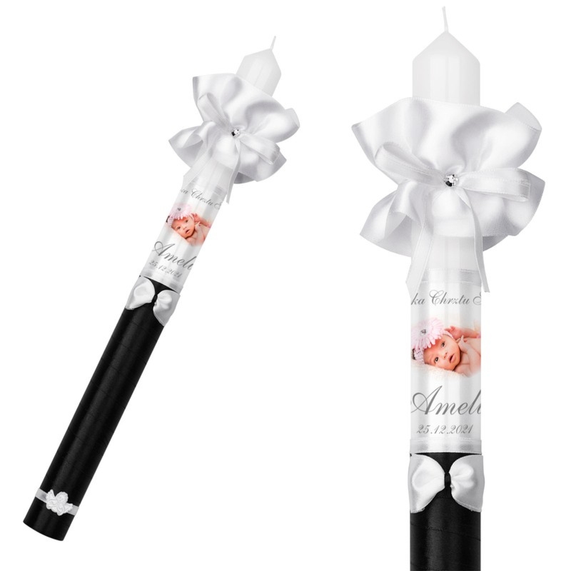 Czarna świeca do chrztu z nadrukiem zdjęcia lub grafiki, imienia i daty, w zestawie biała profitka oraz plastikowy okapnik