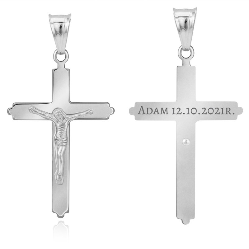 Duży srebrny krzyżyk z Jezusem pr. 925 w prostym stylu, z indywidualnym grawerem imienia i daty
