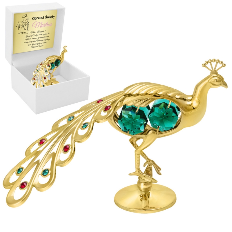 Pozłacana figurka Pawia z zielonym kryształem w pudełku z różową kokardką oraz tabliczką z indywidualną dedykacją