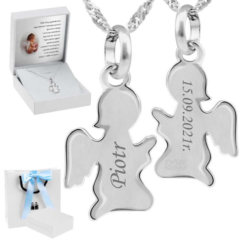 Naszyjnik ze srebra pr.925: wisiorek modlący się Aniołek, łańcuszek singapur i grawer oraz tabliczka z dedykacją
