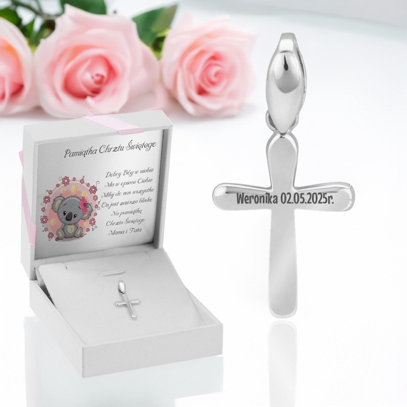 Srebrny krzyżyk pr. 925 z grawerem na rewersie oraz tabliczką dedykacyjną w pudełeczku z różową kokardką