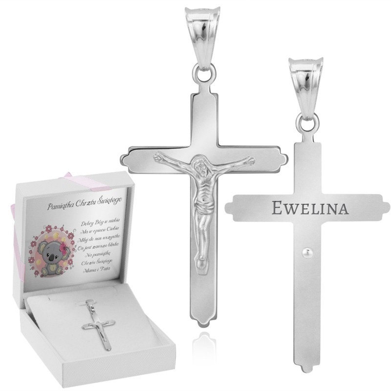 Duży srebrny krzyżyk z Jezusem pr. 925 z grawerem imienia i daty oraz metalową tabliczką z dedykacją w pudełku z różową kokardką