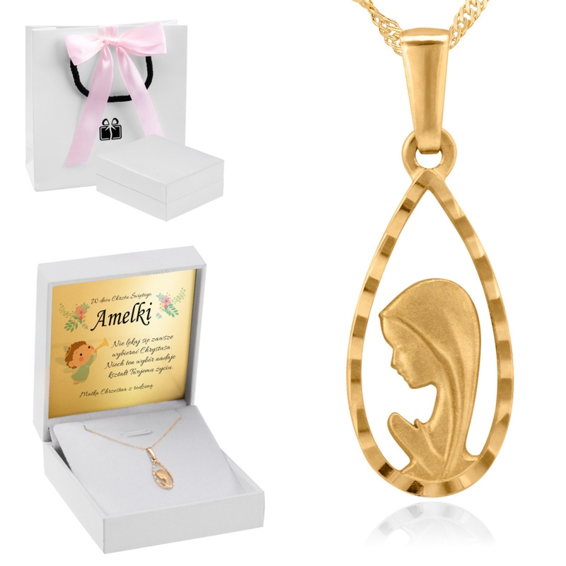 Komunia: Złoty medalik Matka Boska 585 z dedykacją, różowa kokarda