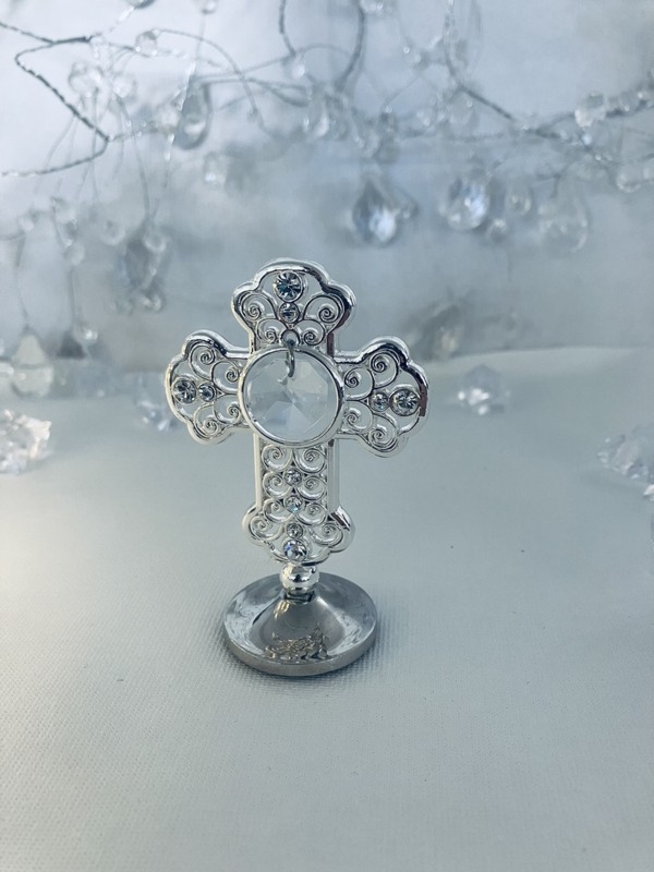 Duża figurka Krzyża platerowana srebrem z 9 zielonymi kryształami SWAROVSKI oraz grawerem na podstawie (Imię lub Data)