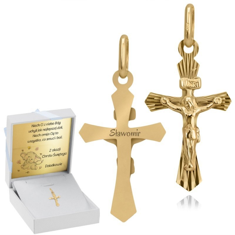 Krzyżyk 585 z Jezusem, grawer laserowy, pudełko z kokardką na Chrzest
