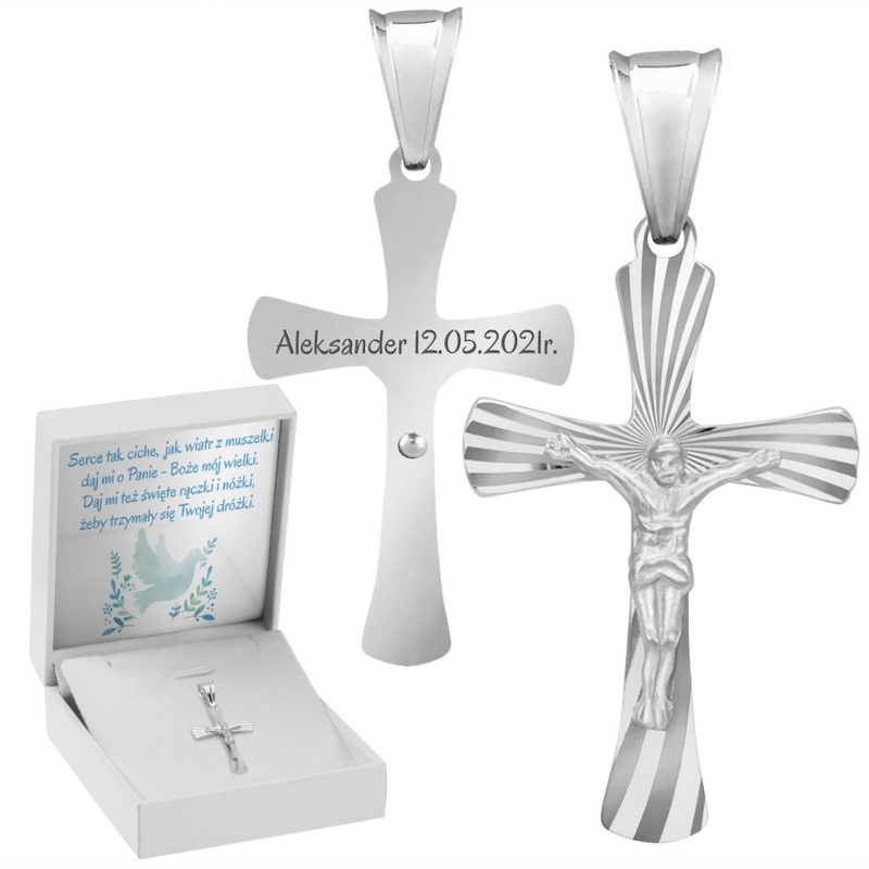 Srebrny krzyżyk 925 z Jezusem z grawerem imienia i daty oraz tabliczką z dedykacją, zdjęciem lub grafiką w ozdobnym białym pudełeczku