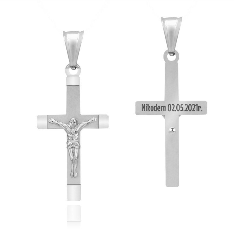 Srebrny krzyżyk pr. 925 z grawerem na rewersie do 20 znaków, z wybitą próbą i metkami jubilerskimi, na Chrzest i Komunię