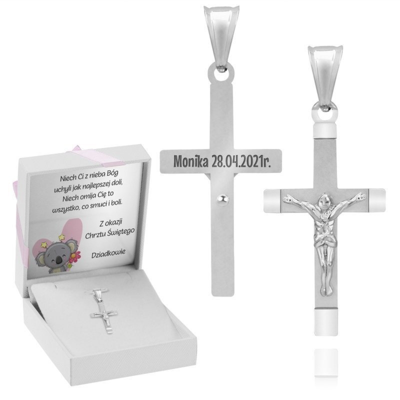 Krzyżyk srebrny 925 z Jezusem: grawer do 20 znaków i tabliczka z dedykacją w pudełeczku z różową kokardką