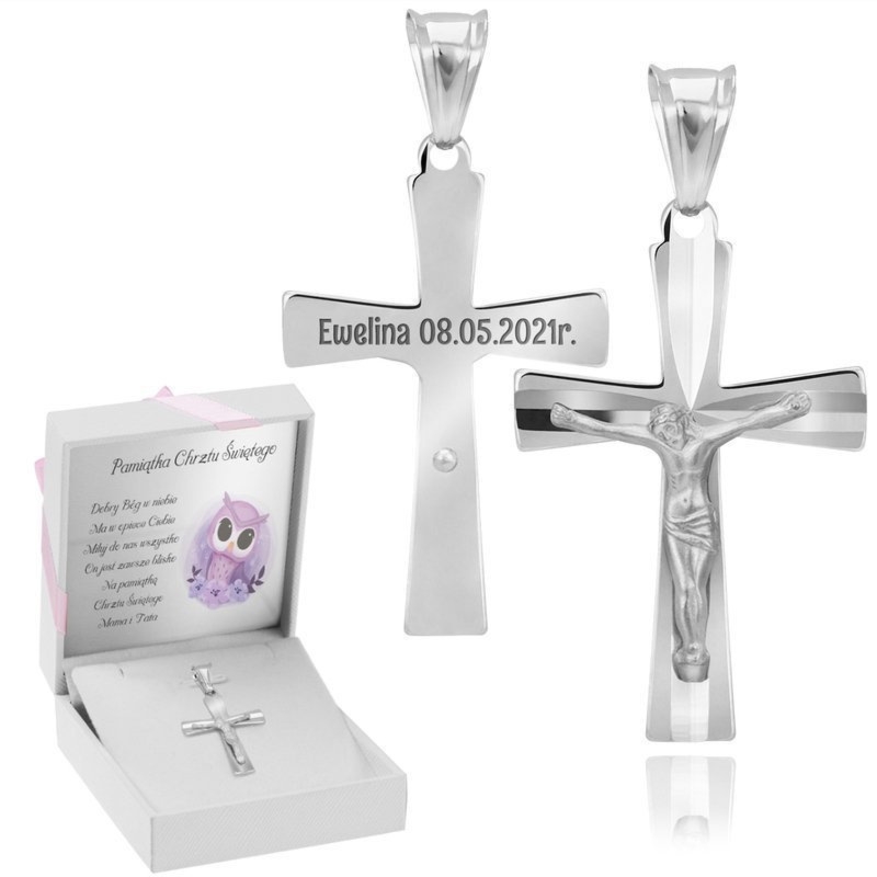 Krzyżyk srebrny 925 z Jezusem: grawer imię i data do 20 znaków oraz tabliczka z tekstem, grafiką lub zdjęciem w pudełeczku z różową kokardką