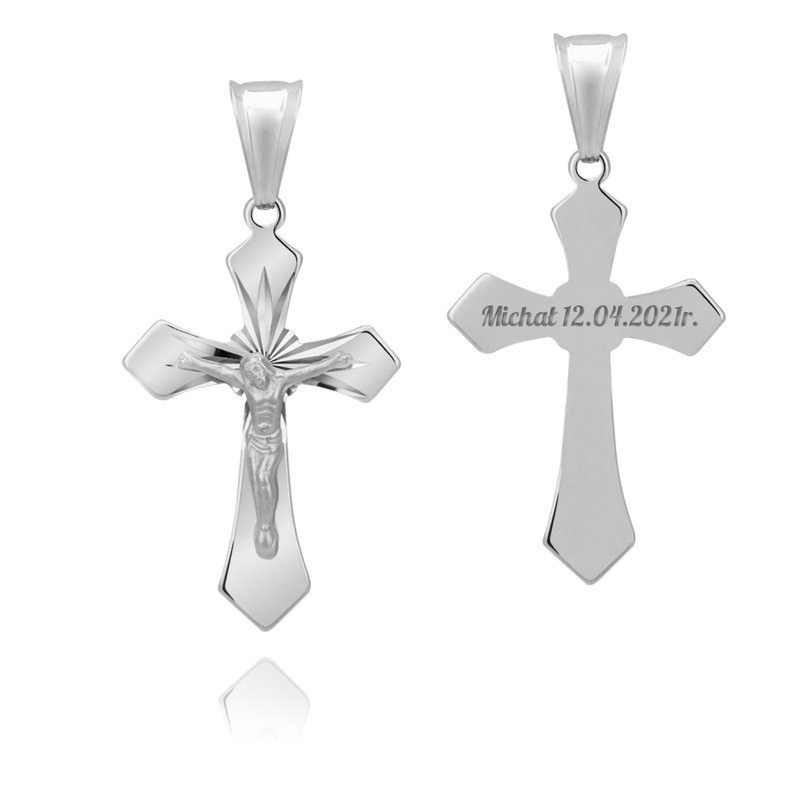 Srebrny krzyżyk pr. 925 z grawerunkiem na rewersie (imię oraz data), z wybitą próbą i metkami jubilerskimi na ważne uroczystości
